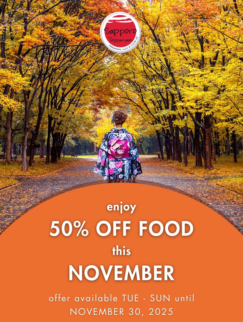 - 50% OFF FOOD only Tuesday – Sunday